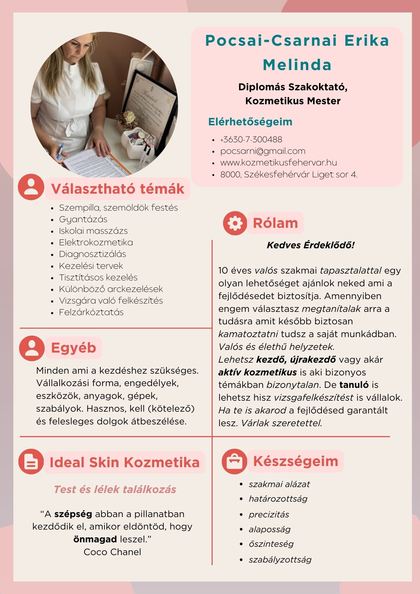- 2023. tól - Amennyiben felnőttként tanulod a kozmetikus szakmát és szükséged lenne egy Mesterre ne habozz keresni. De ha már végeztél vagy újra kezdő vagy és nem vagy biztos a jelenlegi tudásodban akkor is szívesen segítek. Egy a lényeg, hogy végzett kozmetikus légy vagy pedig valamelyik iskolába tanuld a szakmát. Akár önállóan is foglalkozom veled, de ha többen vagytok is vállallak benneteket egy Workshop keretein belül. Vizsgára való felkészítést is vállalok, illetve árképzésben, árlistában és minden olyan más dologban amire egy kozmetikusnak szüksége van munkája során tudok segíteni. Keress bátran. További információt, árat egy személyes találkozó alkalmával kaphattok.